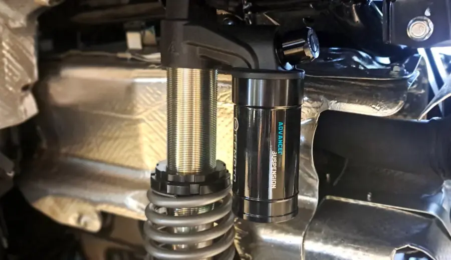 Nezávislé nitrogénové, plne nastaviteľné odpruženie. Vpredu: dvojité oceľové A-ramená / vzadu: vlečné oceľové ramená.